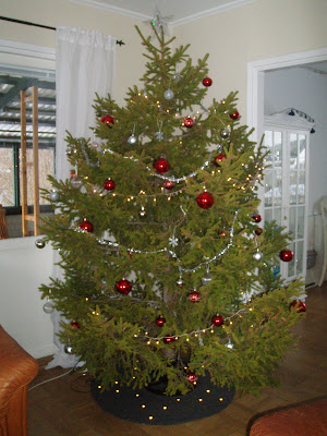 Julgransfoten som vi hade förra året höll inte för årets jättegran....vattnet rann ut på golvet så det fick bli en ny på självaste julafton. Tur att Rusta hade öppet. Men nu är granen på plats och mattan har hängt på tork i pannrummet.