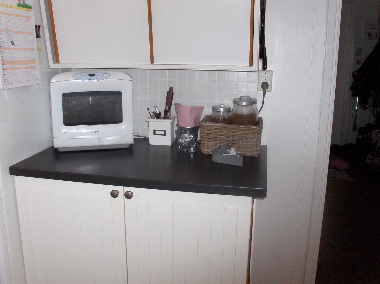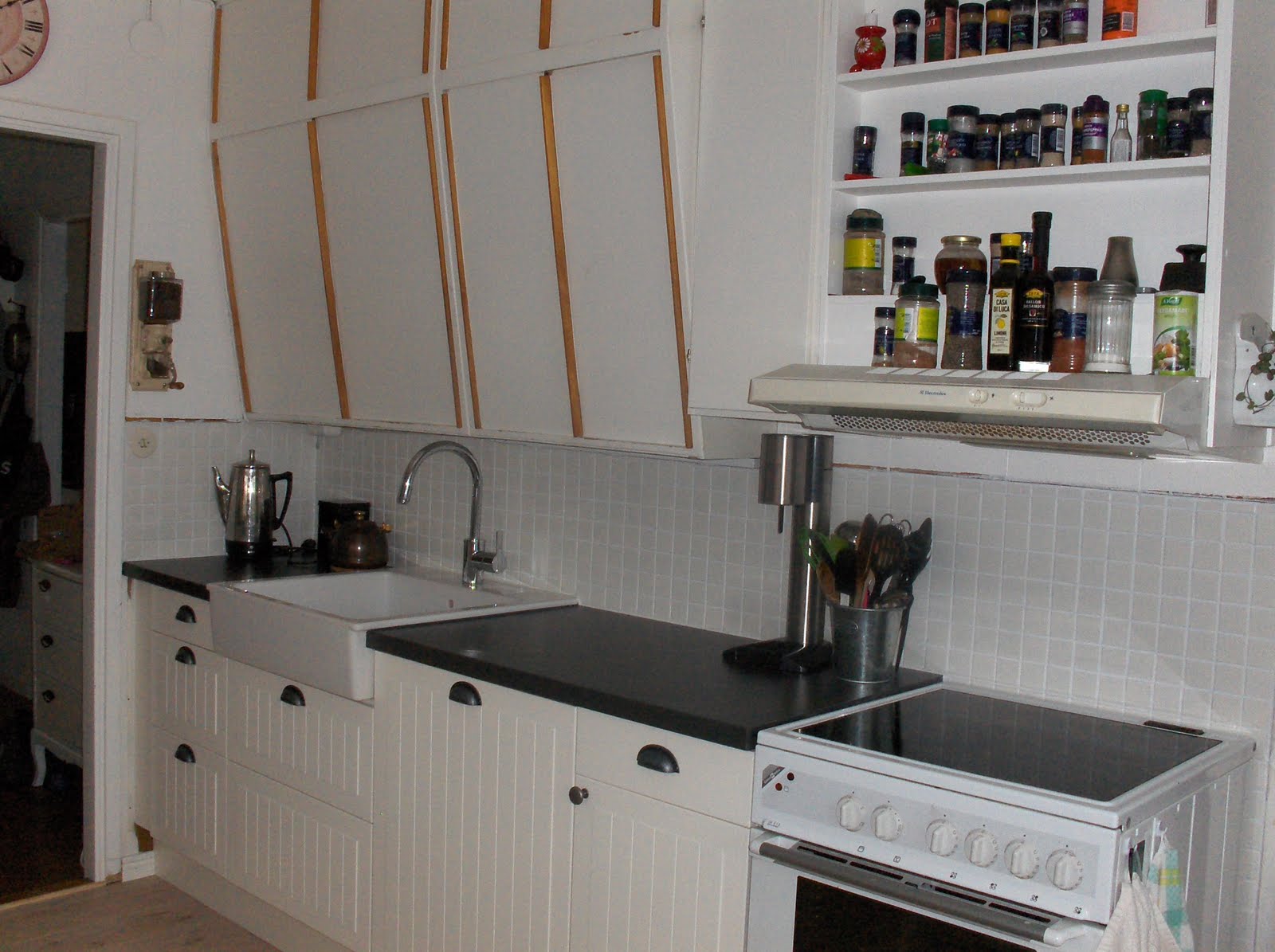 Detta skåp tänkte vi bara byta bänkskiva och luckor på... men som vanligt såg det gamla slitna skåpet hemskt ut när det stod vid sidan om de nya.... så det blev